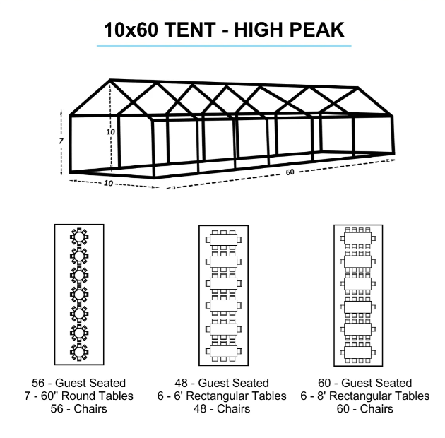 A 10x60 tent can fit 6 60” round tables seating 60 people.