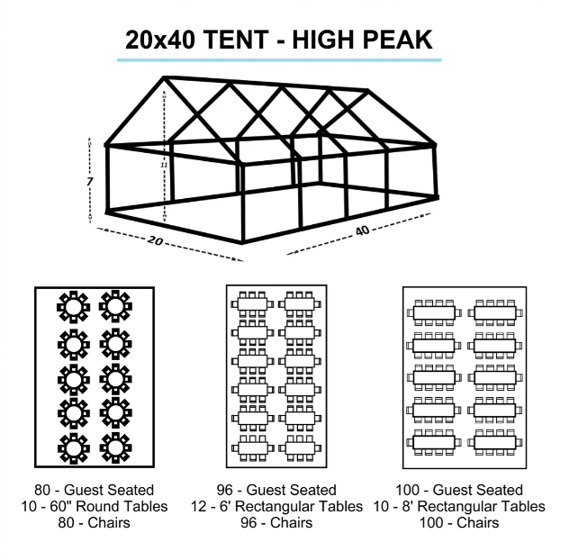 Our 20x40 white tent offers 800 square feet of versatile space, accommodating various seating arrangements and event layouts. Its durable construction and weather-resistant materials ensure protection from the elements, making it an excellent choice for your outdoor event needs.