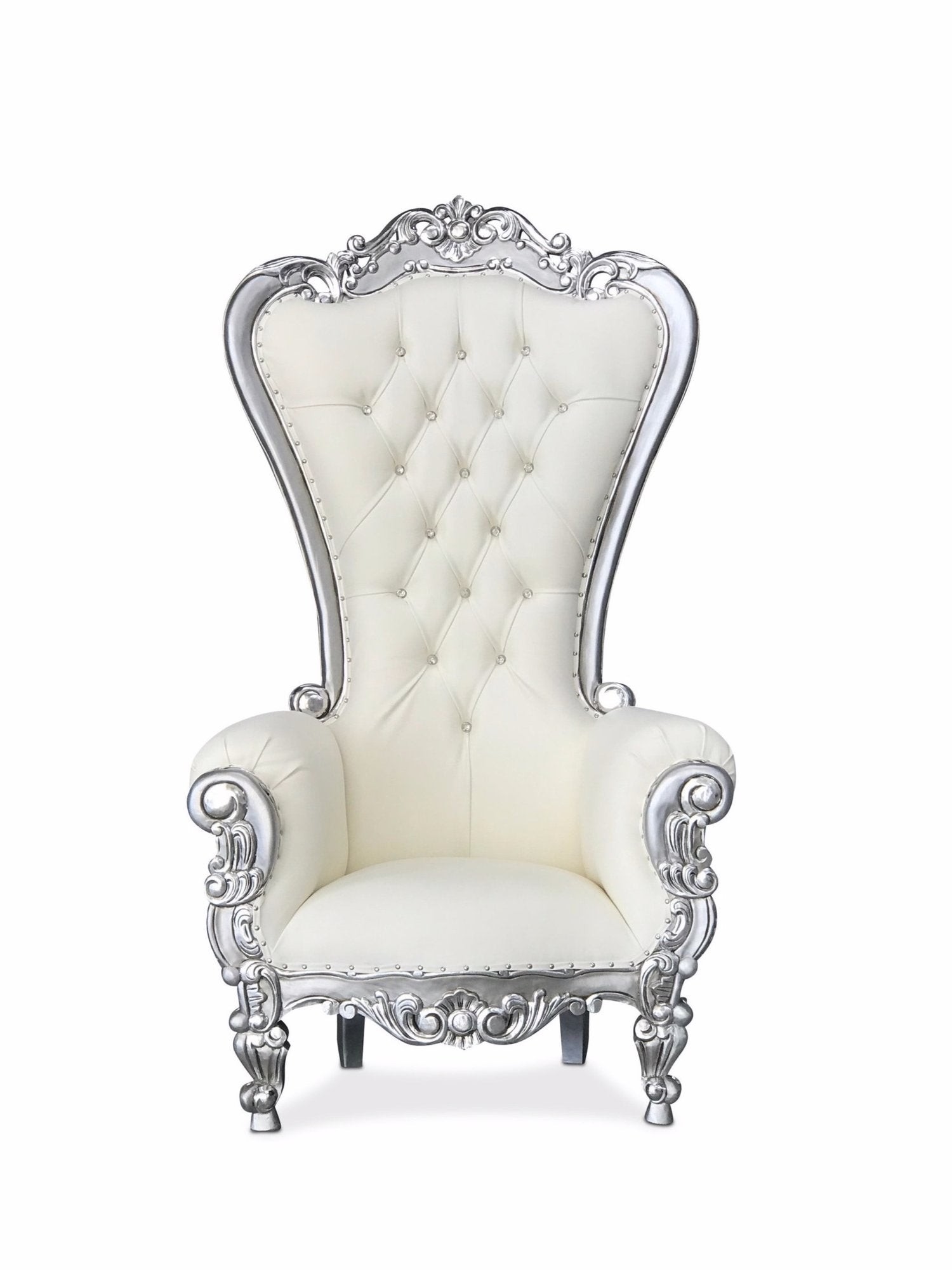 Exuding pure elegance, this white and silver high back throne chair is a true masterpiece. The crisp white color and shimmering silver accents create a sophisticated and regal vibe, making it the perfect accent piece for any upscale event. It's the ideal choice for photo shoots, weddings, corporate events, and more, adding a touch of refinement and class to any setting. Upgrade your decor with this throne chair, and transport your guests to a world of royal splendor!