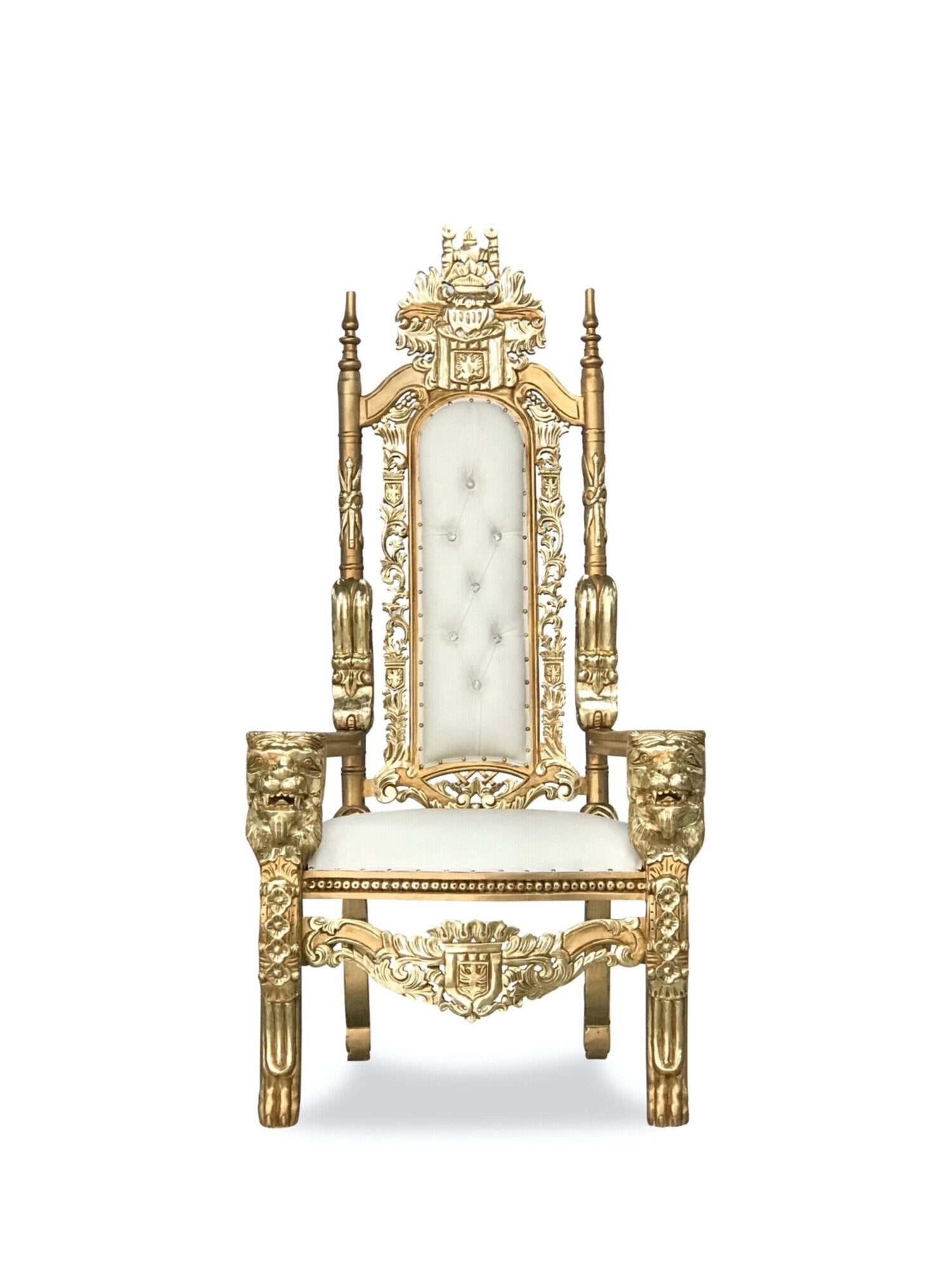 This white and gold king throne chair is the epitome of sophistication and refinement, imbuing any event with an air of royalty and luxury. The pristine white color and dazzling gold accents create a look that exudes elegance and glamour, making it the perfect choice for photo shoots, where it will create a striking focal point, or events and parties, where it will add an extra touch of class. It's the throne that makes every occasion feel fit for a king (or queen)!