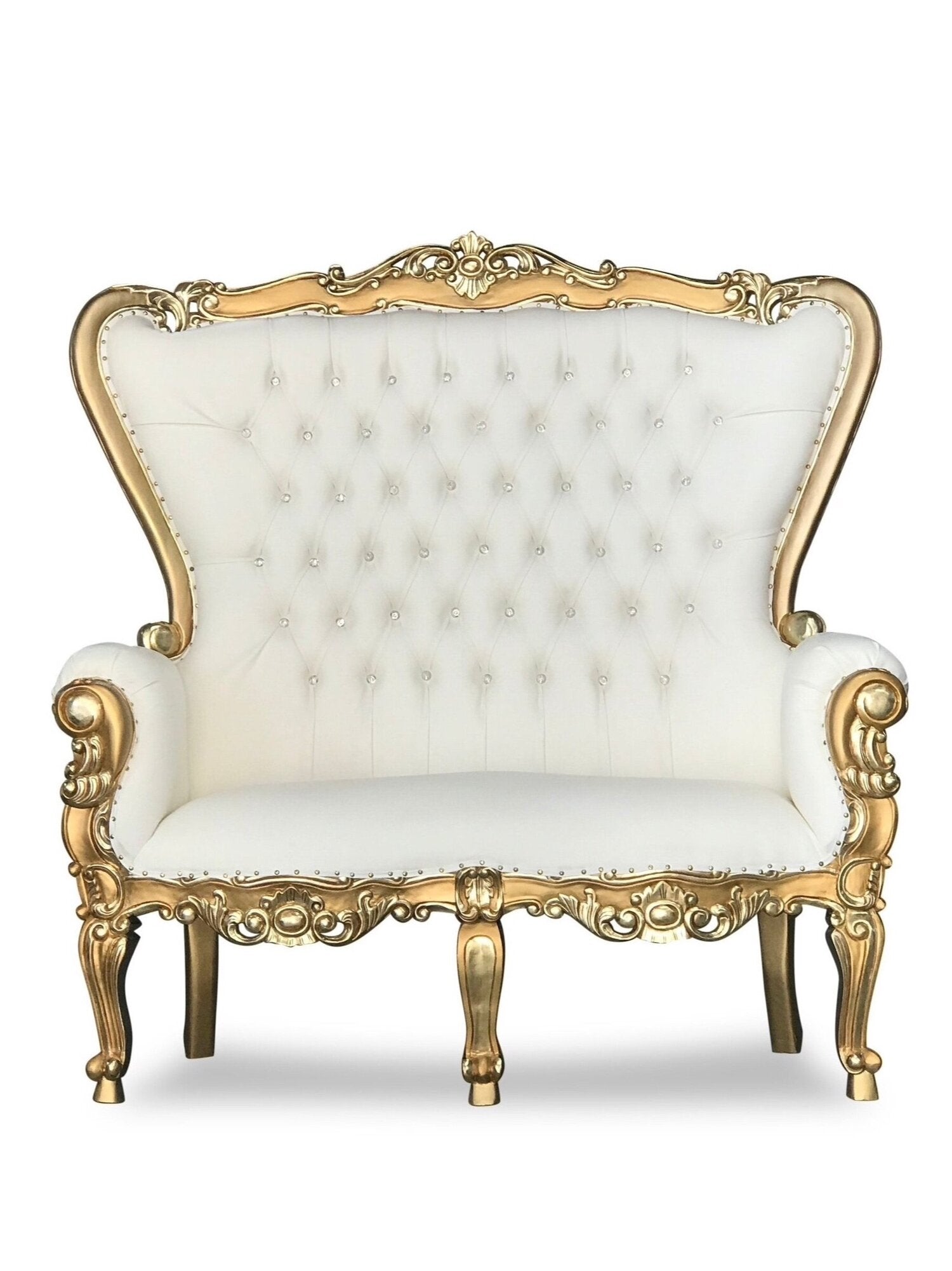 Indulge in refined luxury with this stunning white and gold love seat. The sleek, elegant design features a modern silhouette with a touch of vintage glamour. The plush white cushions, accented by gleaming gold legs and hardware, create a lavish seating experience that's perfect for cuddling up with your loved one. This stunning piece adds a touch of opulence to any room, elevating your decor to a new level of sophistication. It's the perfect combination of comfort and style, making it the crown jewel of any living space.