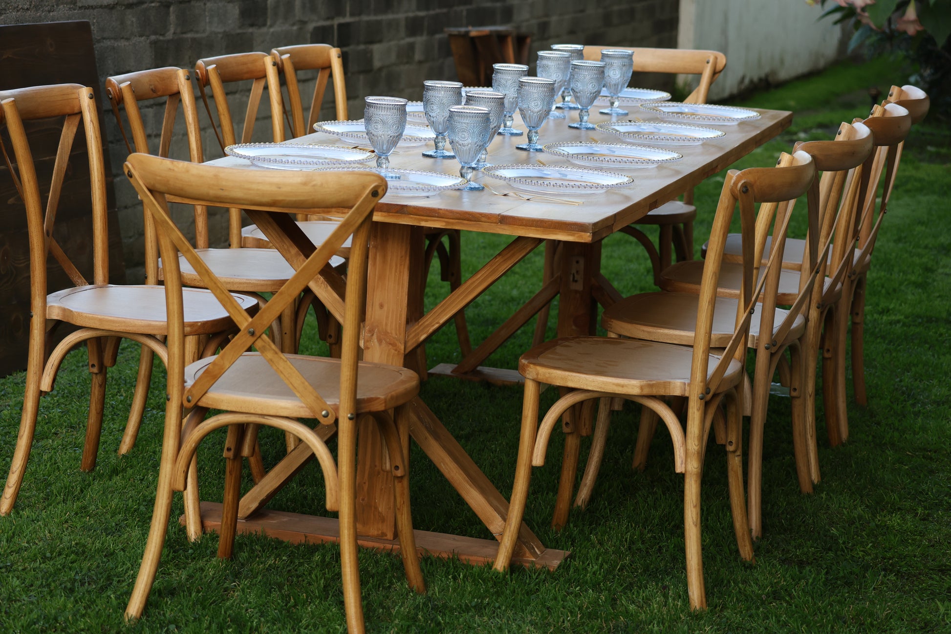 Pair our farm table with our elegant cross back natural wood chairs to complete the look. These chairs are designed with both comfort and style in mind, featuring a curved back for support and a rustic finish that complements the table perfectly.