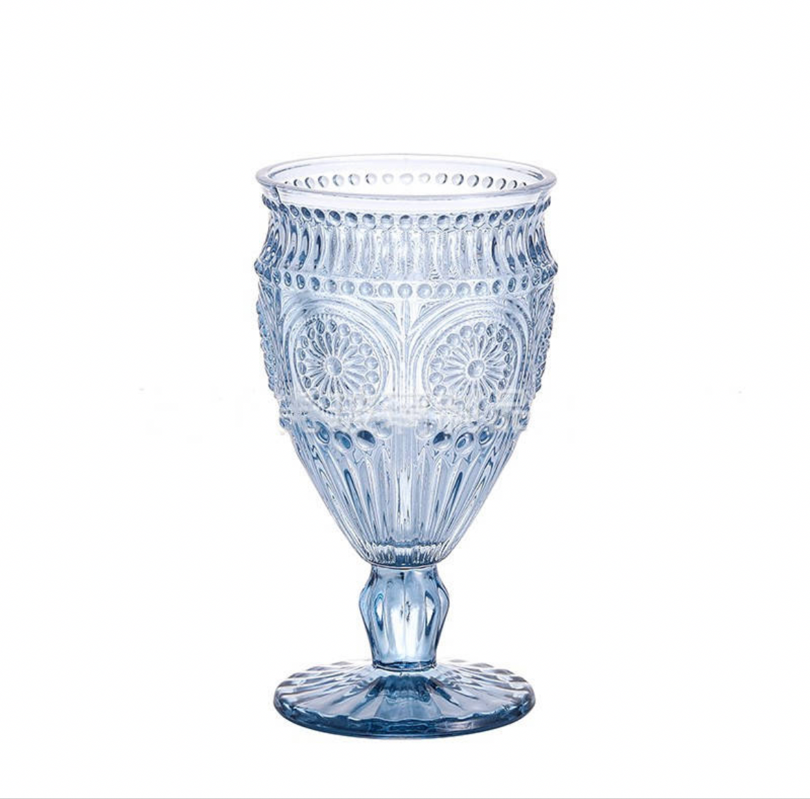 Elevate your event with our exquisite blue sunflower embossed goblet, a truly unique and eye-catching piece of glassware. The intricate sunflower design, embossed on high-quality blue glass, adds a touch of elegance and charm to any table setting.